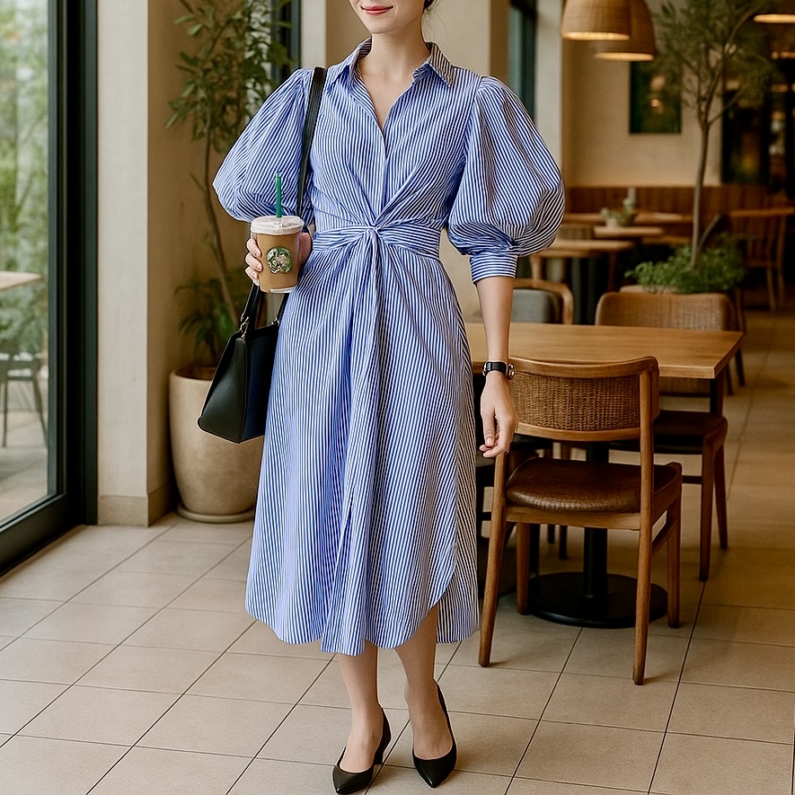 - 上品なストライプ柄とボリュームスリーブが魅力